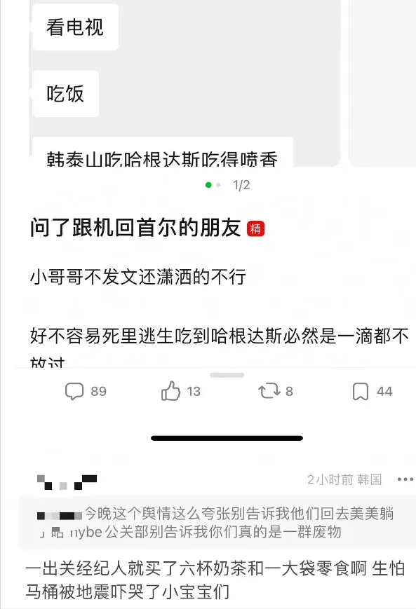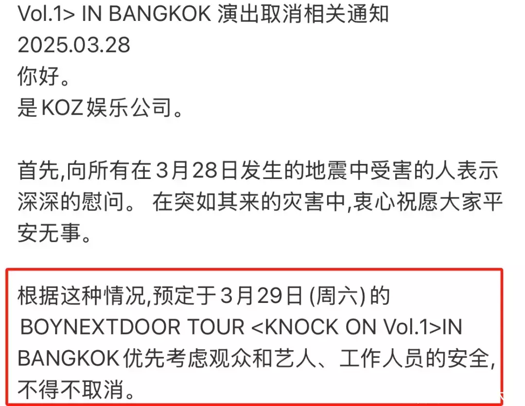 而在粉丝咬牙坚持以为会有奇迹出现的时候,BOY NEXTDOOR已经在经纪团队的帮助下悄悄改签了机票,在飞机禁飞的最后时刻抓住机会成功登上了飞机,直到确认可以返韩后才于事发当日近六点钟正式确认取消演唱会。