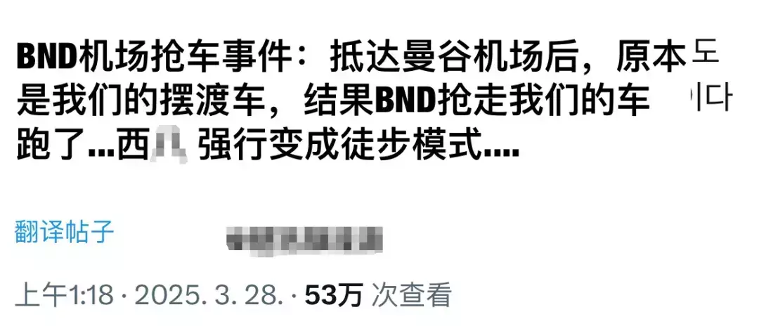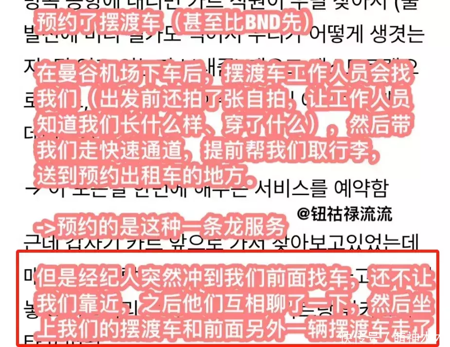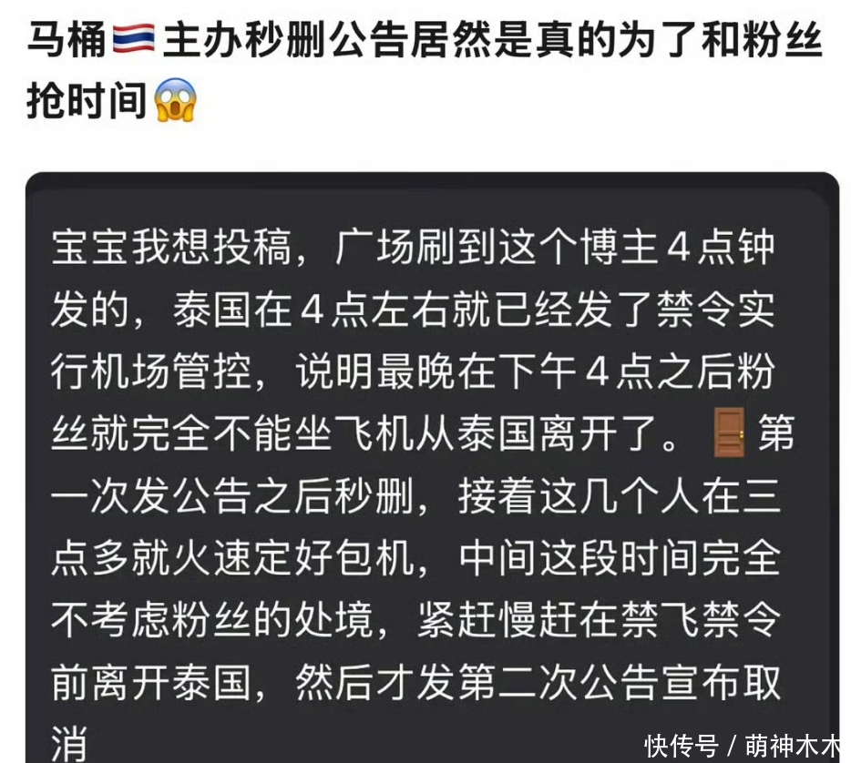 粉丝欢天喜地来到泰国见偶像,没想到意外来临,对方不负责就算了,还抛下粉丝跑路了,炸裂的是,有粉丝发现事态不对,赶紧抓紧时间想办法回国,但没想到前往航班楼的摆渡车还被同样要跑路的偶像本尊抢了,事后经过粉丝不断确认,才知道“门童”的保镖团队不分青红皂白就直接霸占了粉丝的摆渡车,间接导致粉丝的回国计划全部被推翻。